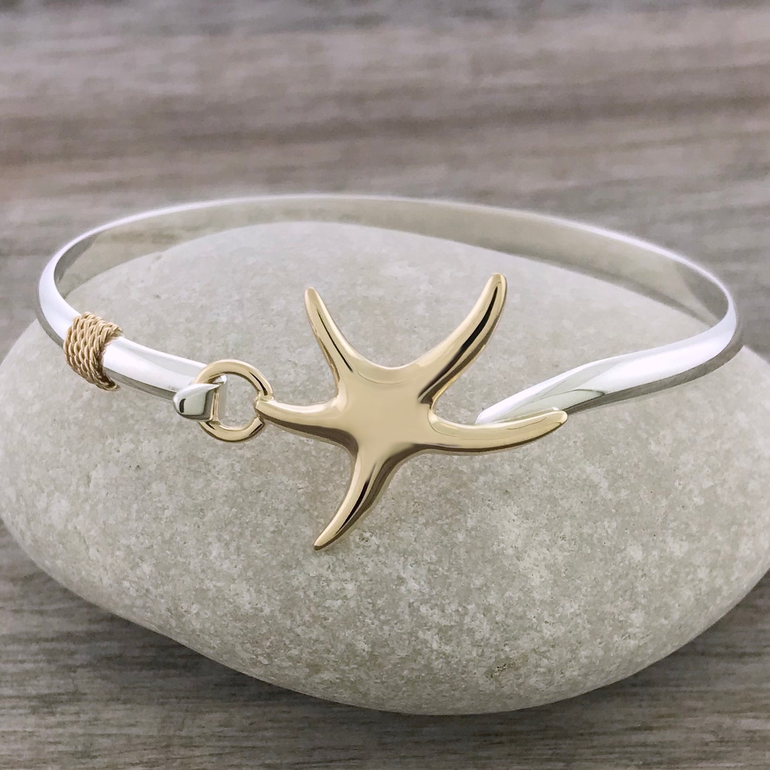 This hook bracelet features a large shiny 14k solid gold "dancing starfish". It makes a beautiful statement on the wrist. There is 14k gold nautical rope detail on the side, which finishes the bracelet beautifully.