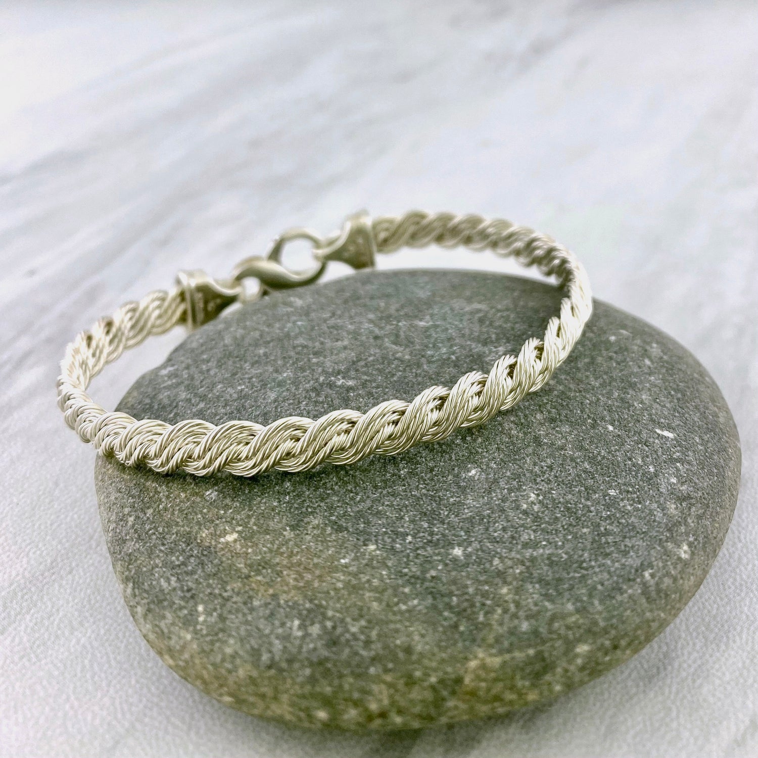 Handcrafted and hand braided in sterling silver, this nautical style bracelet is approximately 6 mm thick and features four braided strands. This bracelet features a lobster clasp.