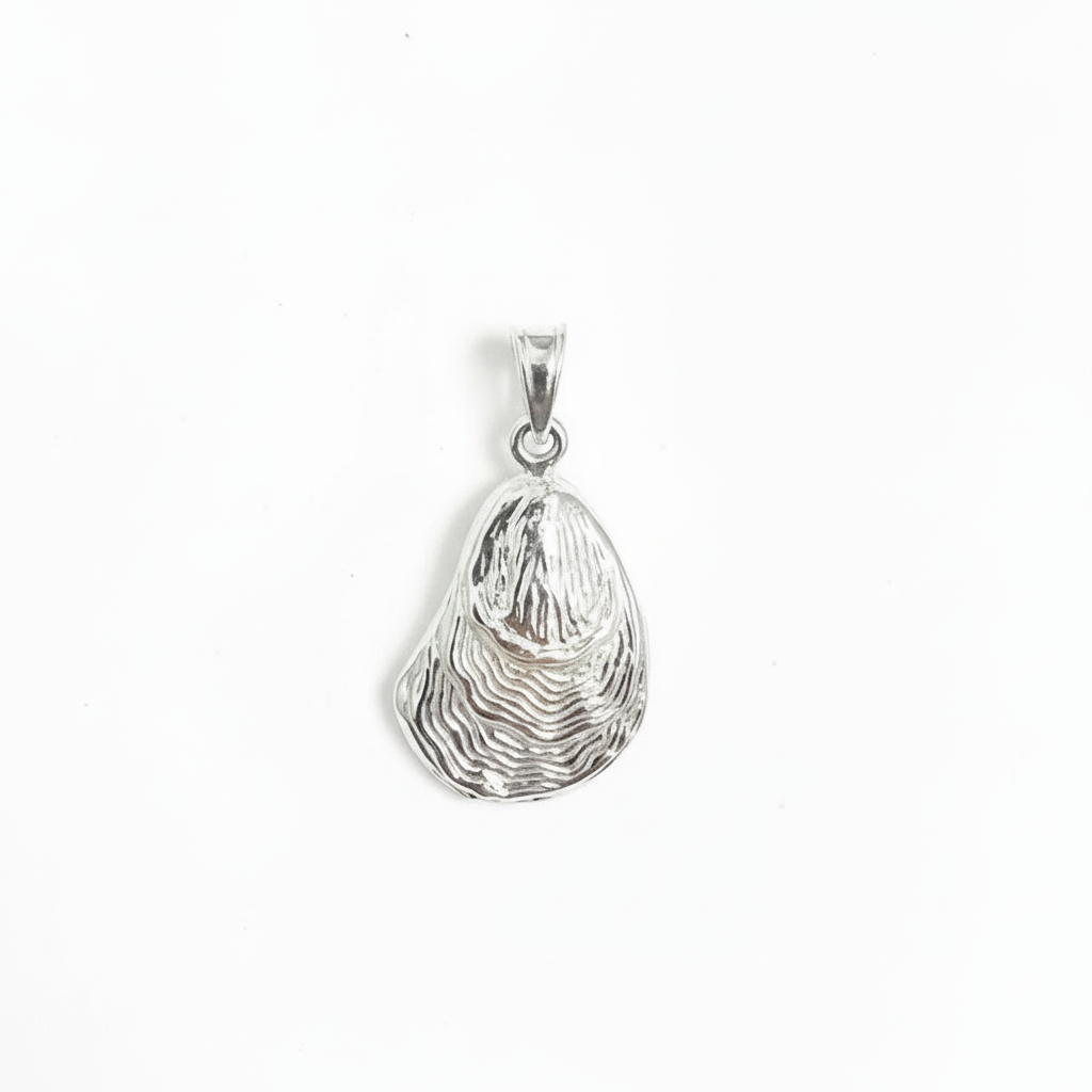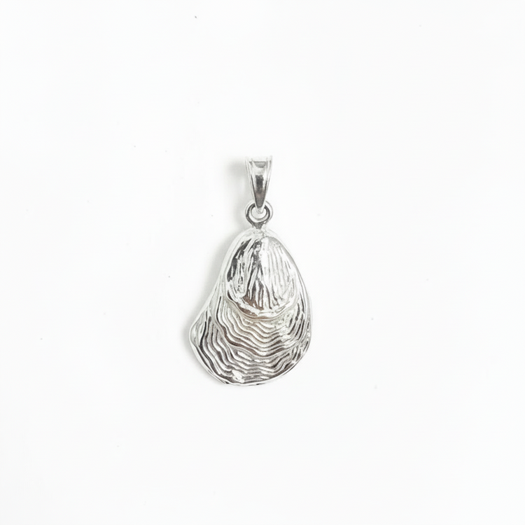 This sterling silver pendant features a textured 3-D oyster shell. The oyster is solid, has a pattern on both sides, and has some weight to it. It is crafted with beautiful detail to represent a true to life oyster shell.