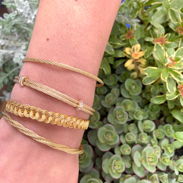 Handcrafted and hand braided in 14K gold, this nautical style bracelet is 7mm thick and features three braided strands. Flexible and comfortable, Mariner's bracelets are the ultimate in understated elegance.  This bracelet features a seamless and secure bar clasp.