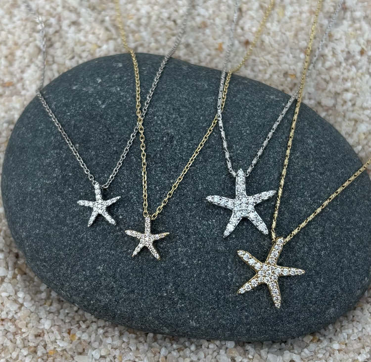 These 14K gold starfish necklaces are available in 14K yellow or white gold in both small and petite sizes! Necklaces measure 18" in length.