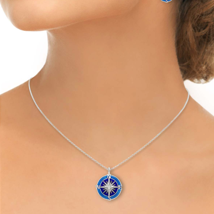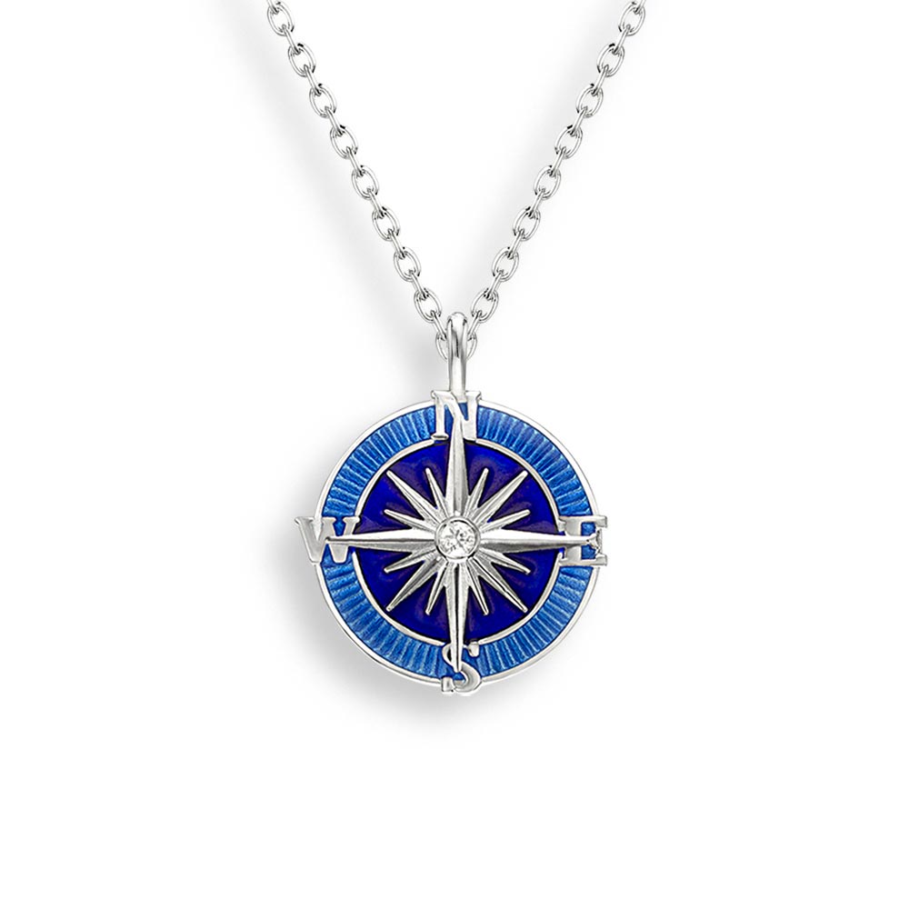 This beautiful vitreous blue enamel compass rose is made from sterling silver and features a central white sapphire.