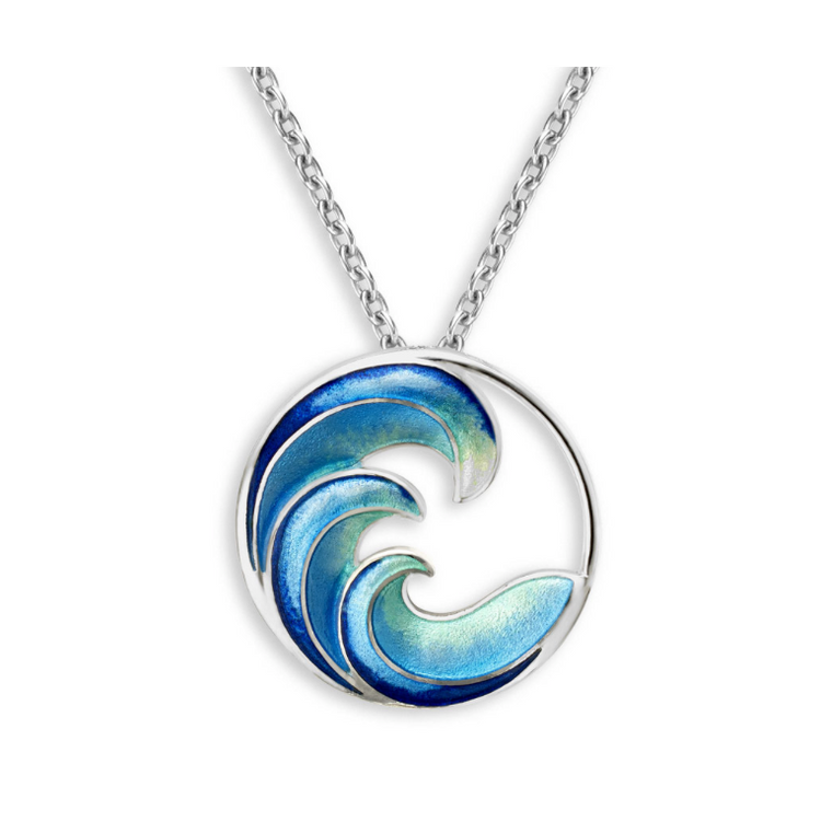Turquoise Ocean Waves Necklace in Sterling Silver with Vitreous Enamel. Adjustable 18-inch chain included. Rhodium Plated for easy care.