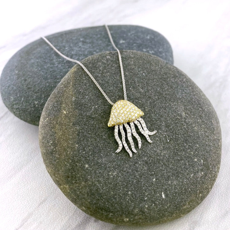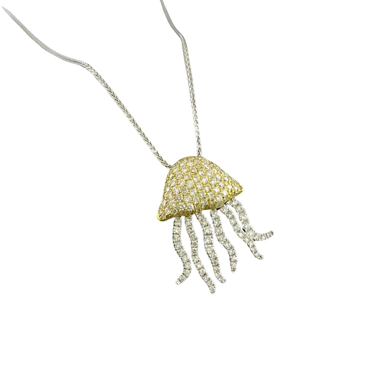 This two tone 14K gold pendant is playful and reminiscent of the summer! The jellyfish pendant features .62 tcw of diamonds and tentacles that are mobile.