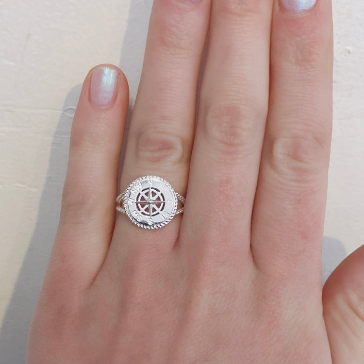 An all sterling silver ring features a rope designed split-shank with a smooth compass rose for a unique design.