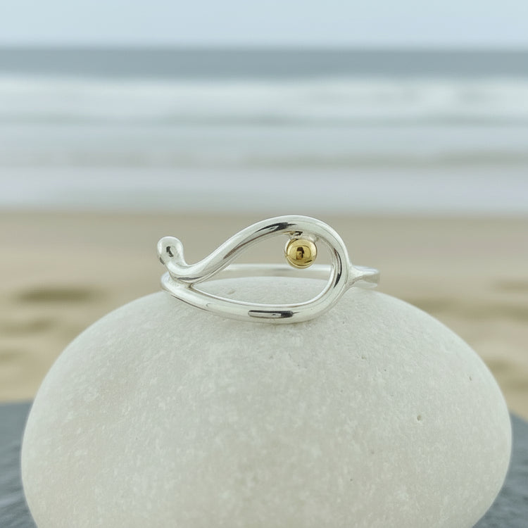 This hand-crafted sterling silver ring features a 14k gold eye and has a classic, yet whimsical abstract whale design.