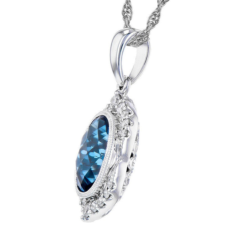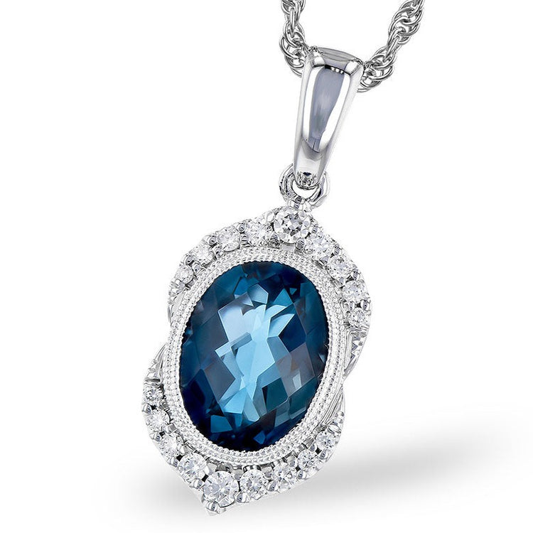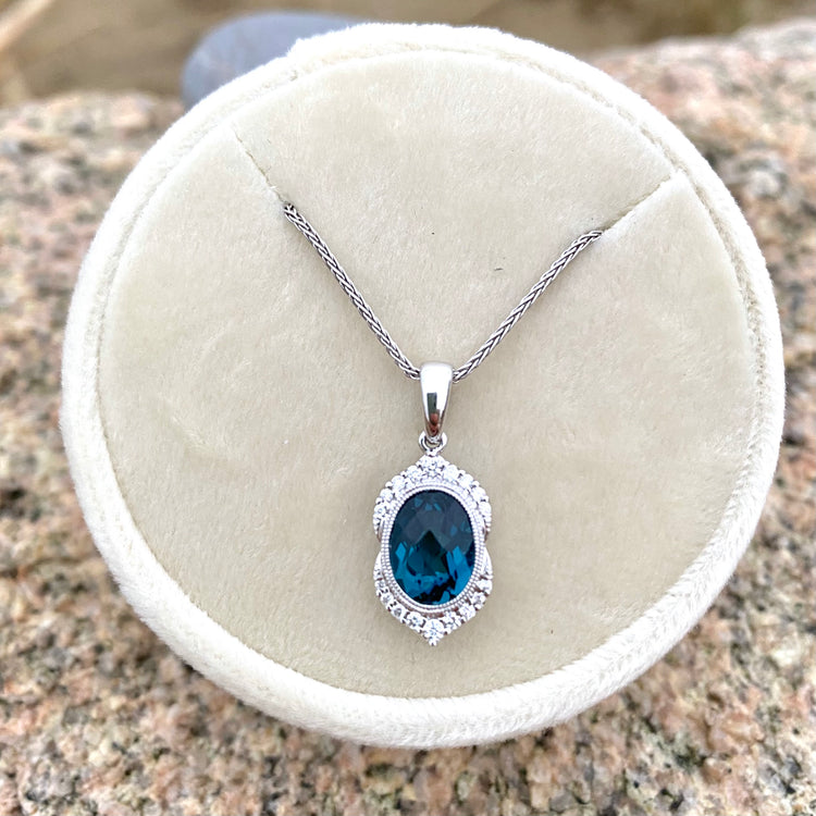 14k white gold pendant set with a gorgeous deep "London" blue topaz. Topaz is surrounded by natural diamonds in a vintage inspired setting, for the ultimate in casual elegance. Pendant comes with 14k 18" white gold chain. Contact us for other chain options.  Oval blue topaz weighs 1.96 ct, diamonds weigh .14 ct.