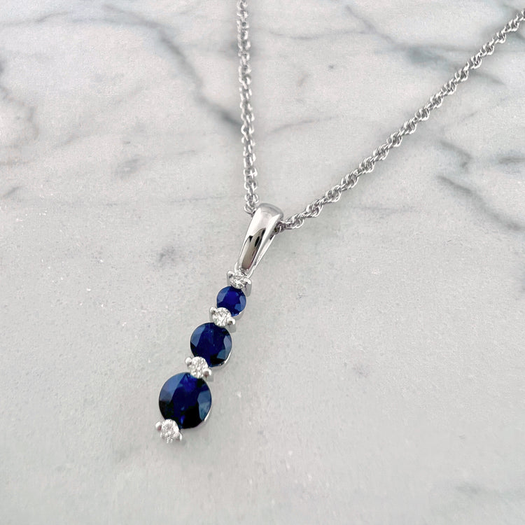 This sapphire and diamond necklace is meant to represent the many steps and milestones in life. Set in 14k white gold, the three graduated sapphires total .55 tcw and are complimented with four petite diamonds.