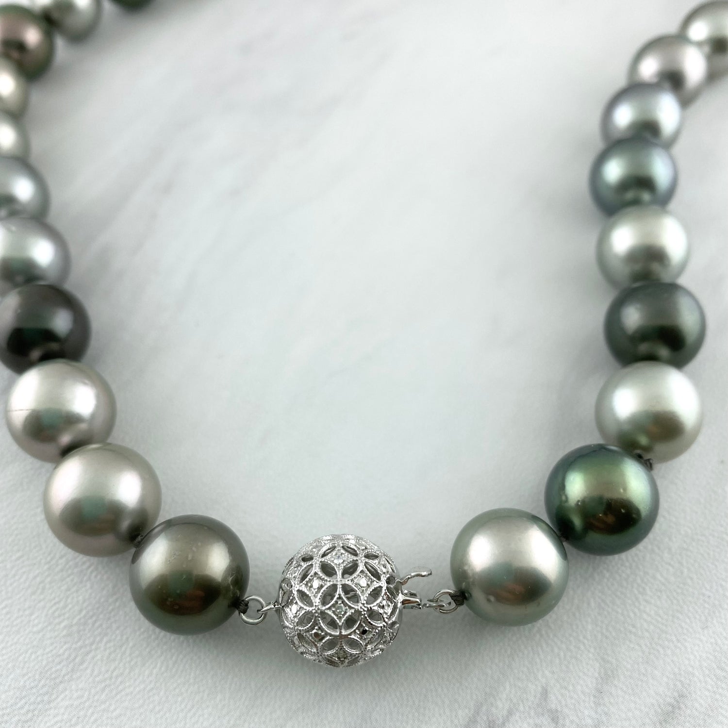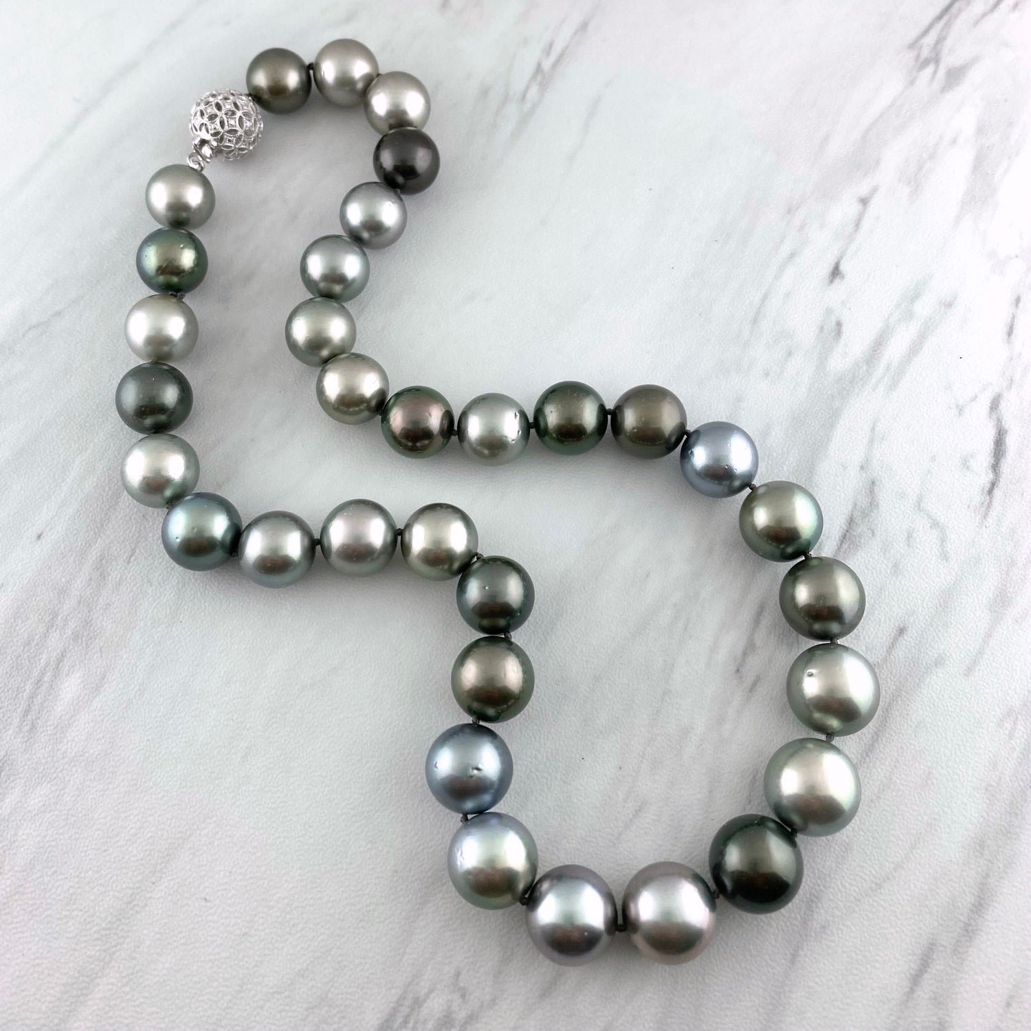 This stunning 11-13mm Tahitian South Sea pearl necklace features rare, superior quality round pearls in a range of gray hues.  Natural gray color with variations that include tones of green, blue, purple and silver.
