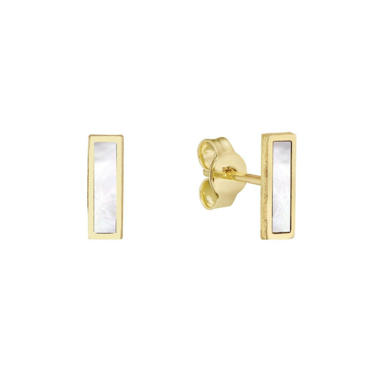 These beautiful 14k earrings feature a 3x9mm bar with beautiful gemstones inlayed. Available in solid onyx, mother of pearl and turquoise.