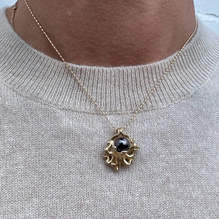 This amazing pendant by Steven Douglas is unique and show stopping! The specialty satin finish on the 14K octopus is accented with two diamond eyes and features a 9mm Tahitian pearl. This pendant comes on a 18" wheat chain.