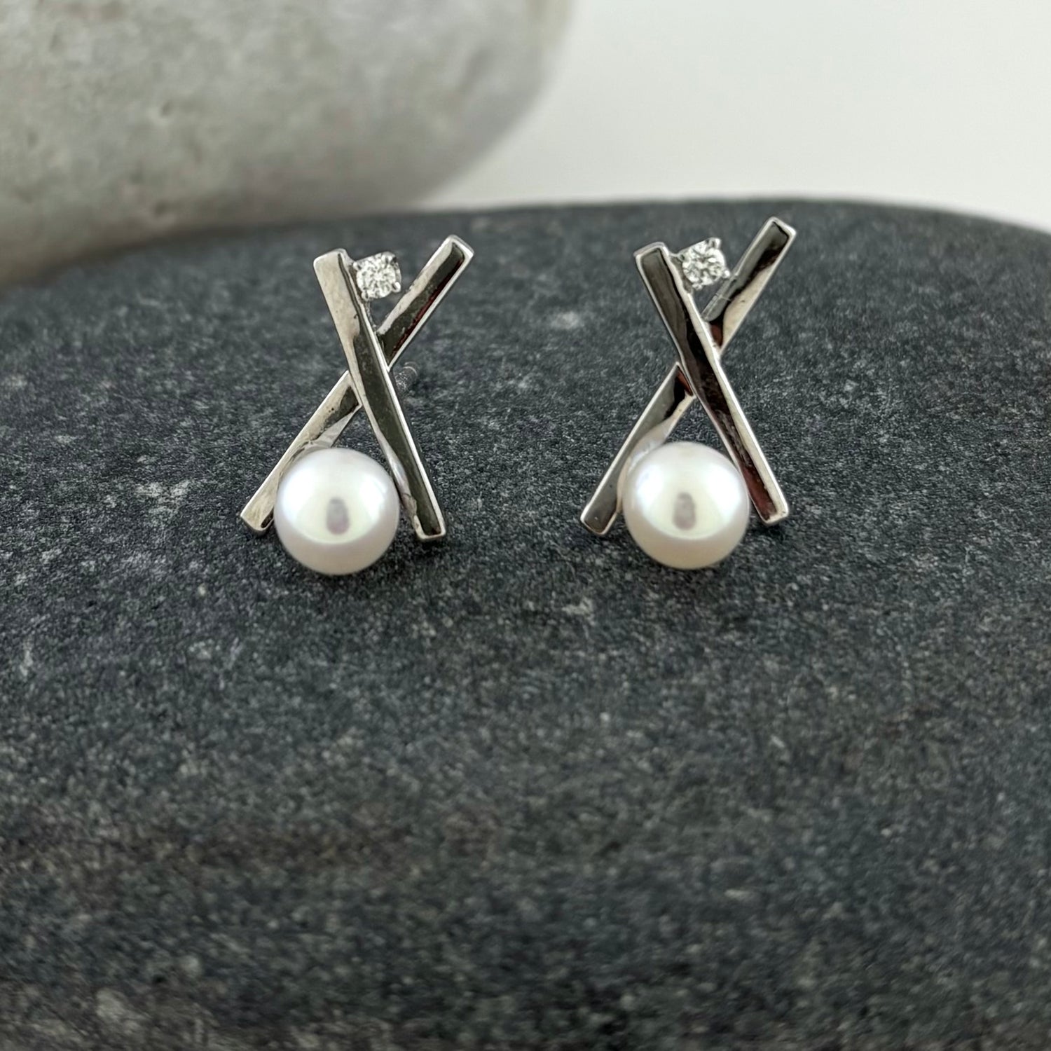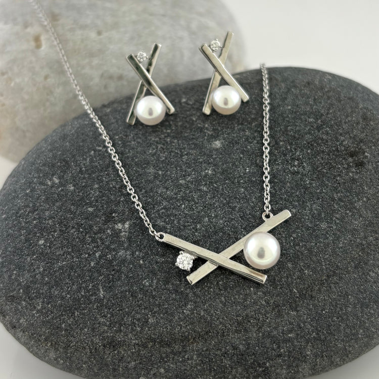 This new design is an updated take on the XO hugs and kisses symbol of love. Sterling silver crossed bars are accented with a sparkling natural .04 ct diamond and a shimmering 5mm cultured freshwater pearl.  Easy to dress up or down.  Pearls are always on trend!