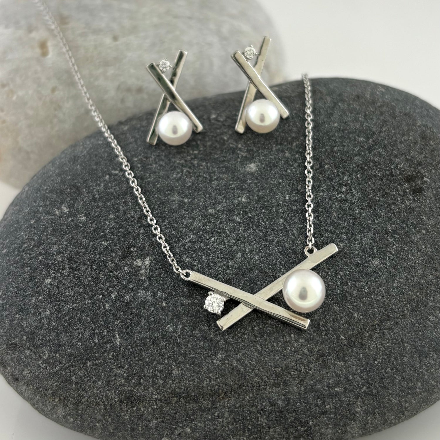 This new design is an updated take on the XO hugs and kisses symbol of love.  Sterling silver crossed bars are accented with a sparkling natural .07 ct diamond and a shimmering 6mm cultured freshwater pearl.  Easy to dress up or down.  Pearls are always on trend! Available in 16 or 18 inches.