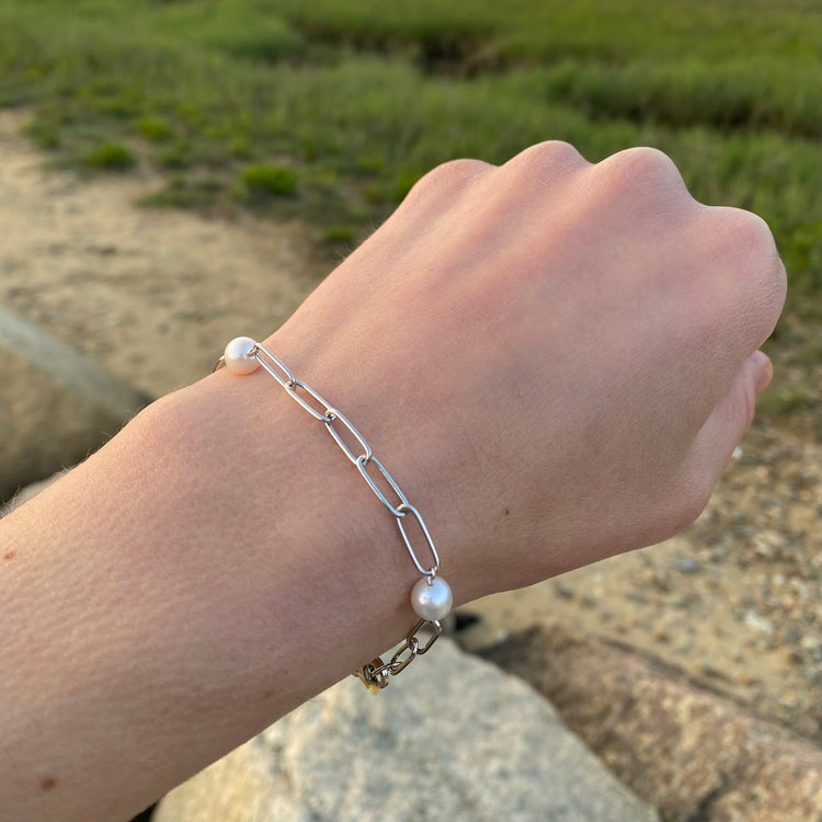 Sterling silver paper clip style links alternate with beautiful 8mm cultured freshwater pearl stations. A modern classic! Matching necklace available. Adjustable length 6.5-7".