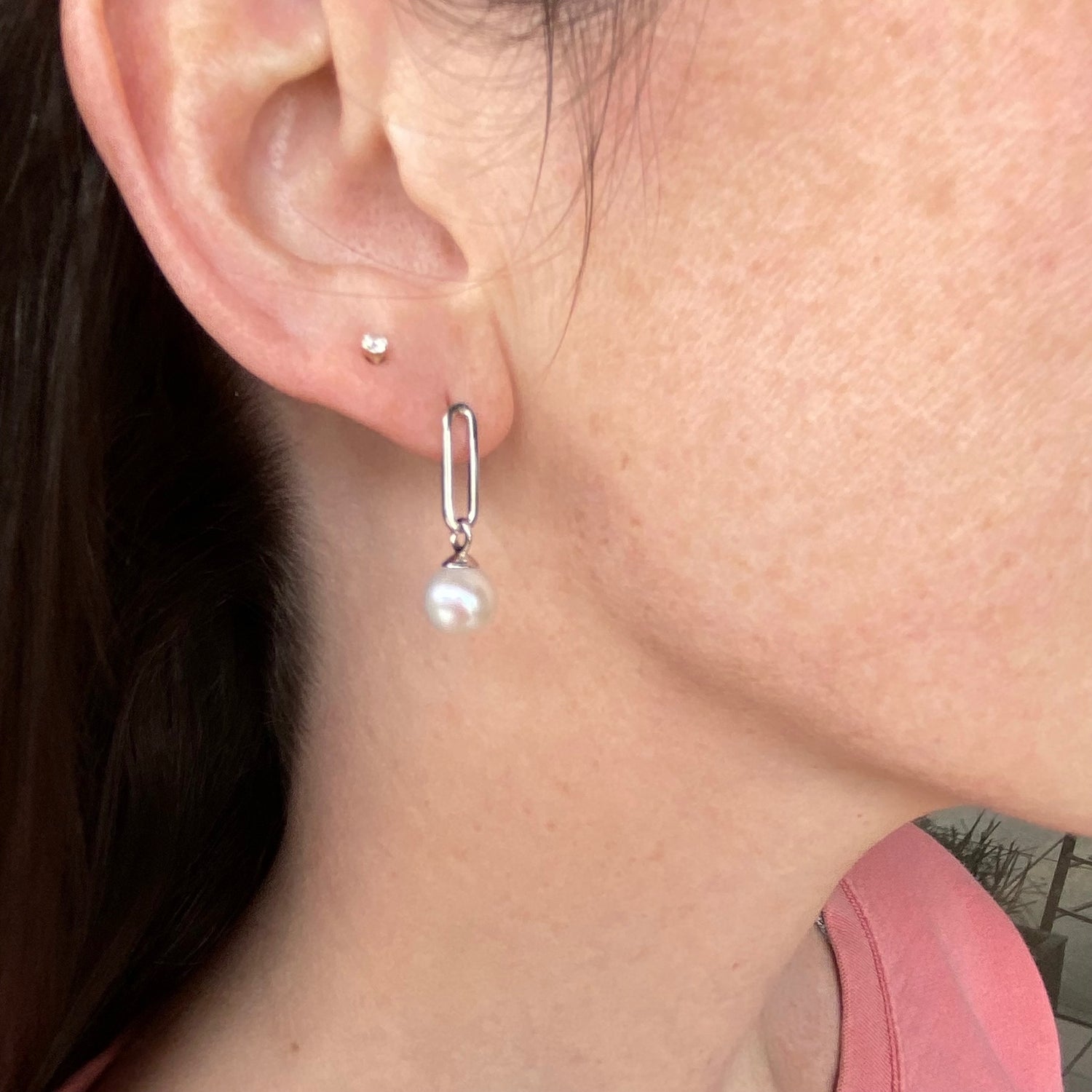 Sterling silver paper clip style earrings with a beautiful 8mm cultured freshwater pearl. These earrings are a modern classic and can be dressed up or down!