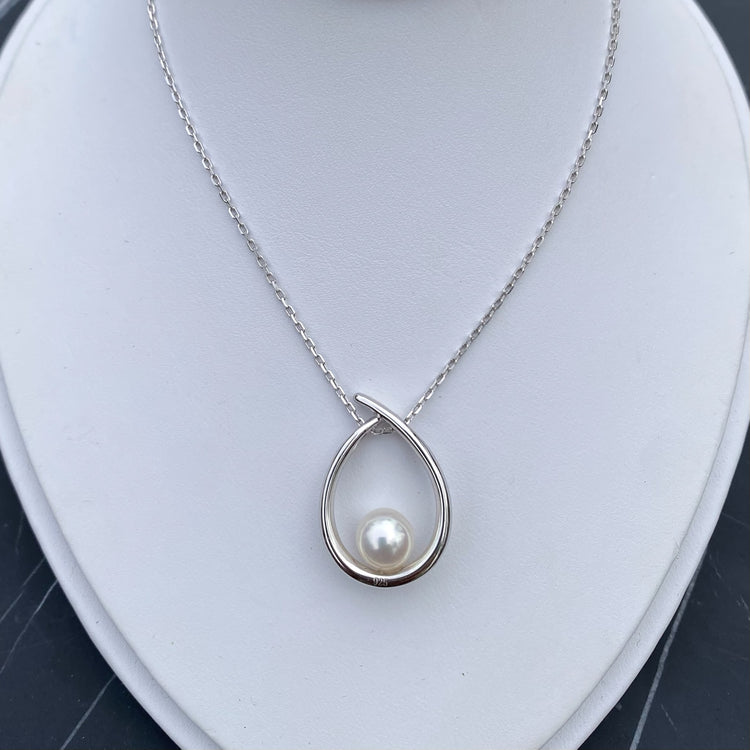 Sterling silver open oval pendant with an attached 7mm cultured fresh water pearl. This modern style pendant comes on an 18" diamond cut sterling silver with rhodium cable chain.