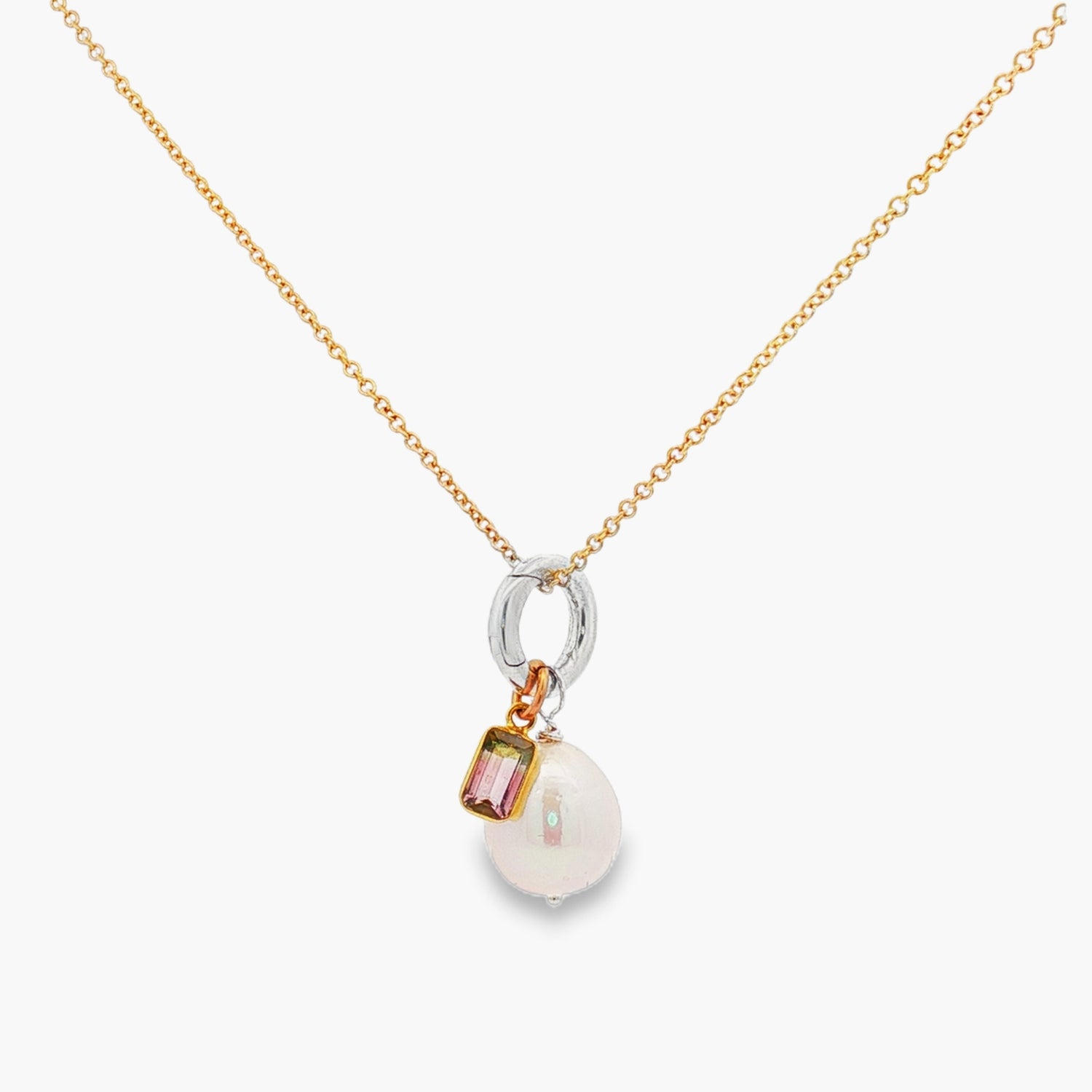 Handmade necklace features a glowing white freshwater baroque shaped pearl with a watermelon tourmaline set in 18K gold.  Pearl and tourmaline hang from sterling silver round charm lock and a 24" 14K gold filled cable chain.