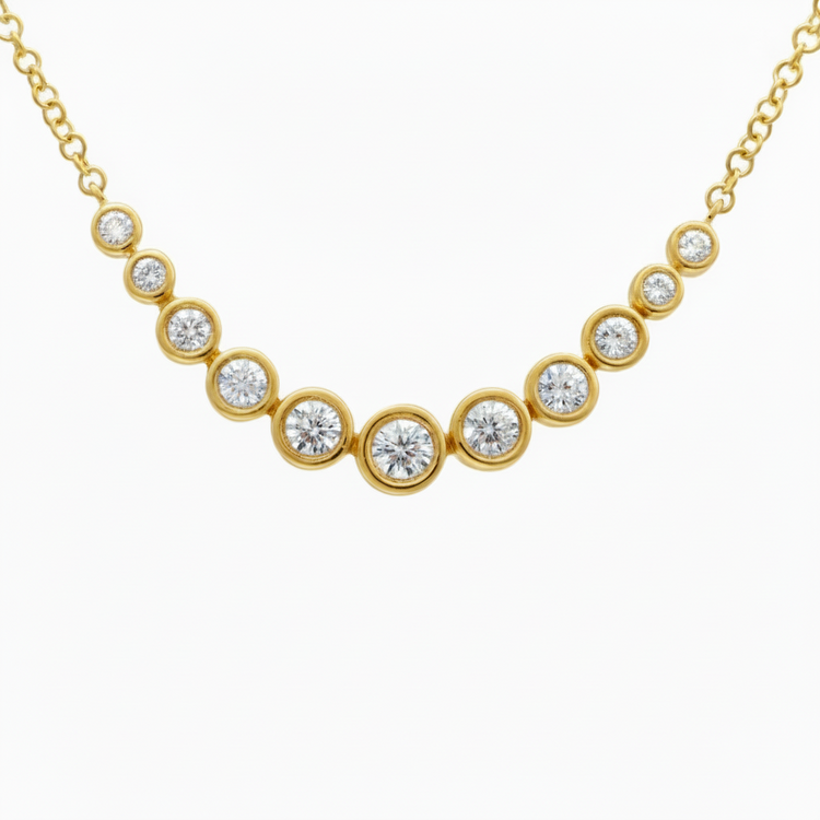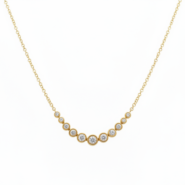 This 14K Yellow Gold necklace features 11 bezel set diamonds in a gradient of sizes with the largest at the center. The necklace measures 16/18" and features a sturdy lobster clasp. This necklace is gorgeous to wear for any occasion or for everyday wear.