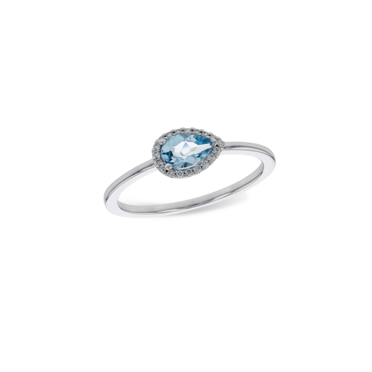 This stunning 14K white gold ring features an east-west pear shaped Aquamarine weighing .36 ct. Aquamarine is surrounded by a halo of round natural diamonds with a total carat weight of .42 ct. In stock in size 7.