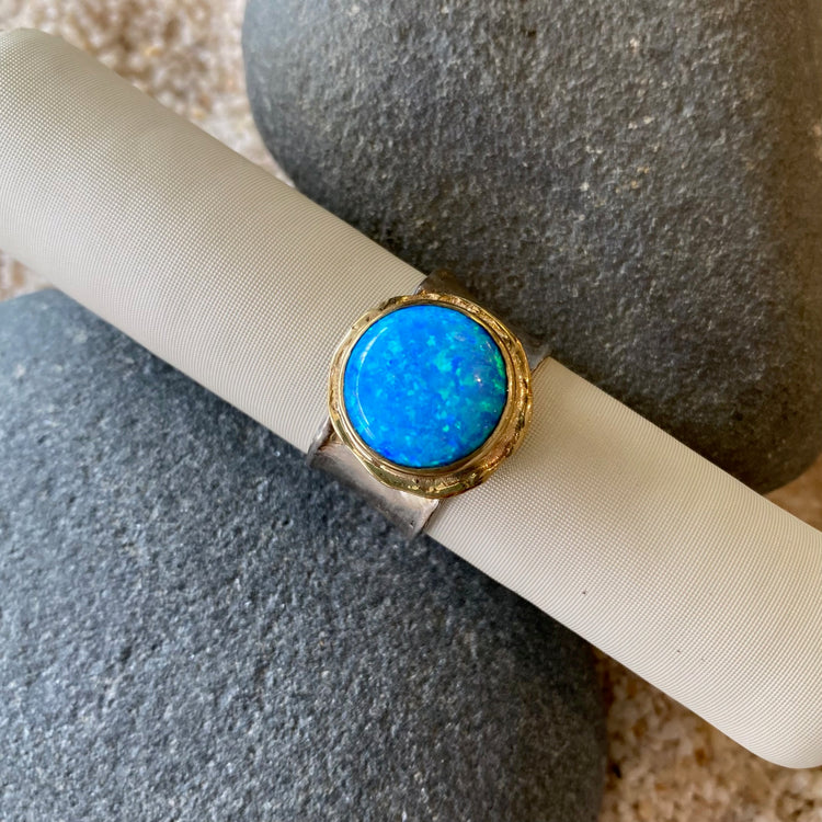 This standout ring features a stunning faceted round opal set in 9k yellow gold on a wide sterling silver band.