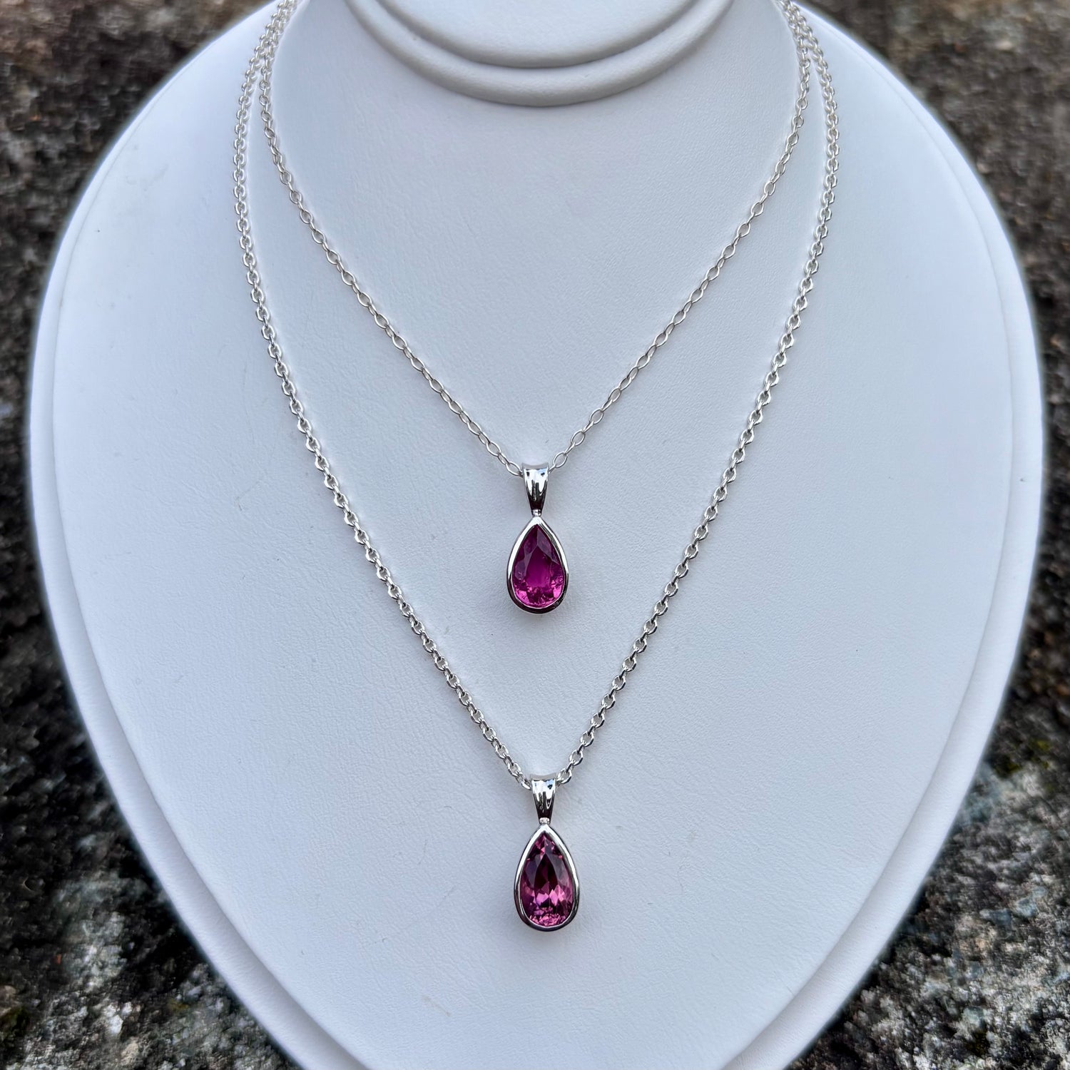 Two vibrant pink tourmaline stones sparkle in these simple and elegant bezel set pendants.  Stones are set in sterling silver and hung from 18-19" silver cable chains.  Choose from smaller .92 carat pendant, with vibrant pink color, or larger 1.03 carat oval pendant, with deep pink color.  Tourmaline is the birthstone for October.  Contact us for other length chains.
