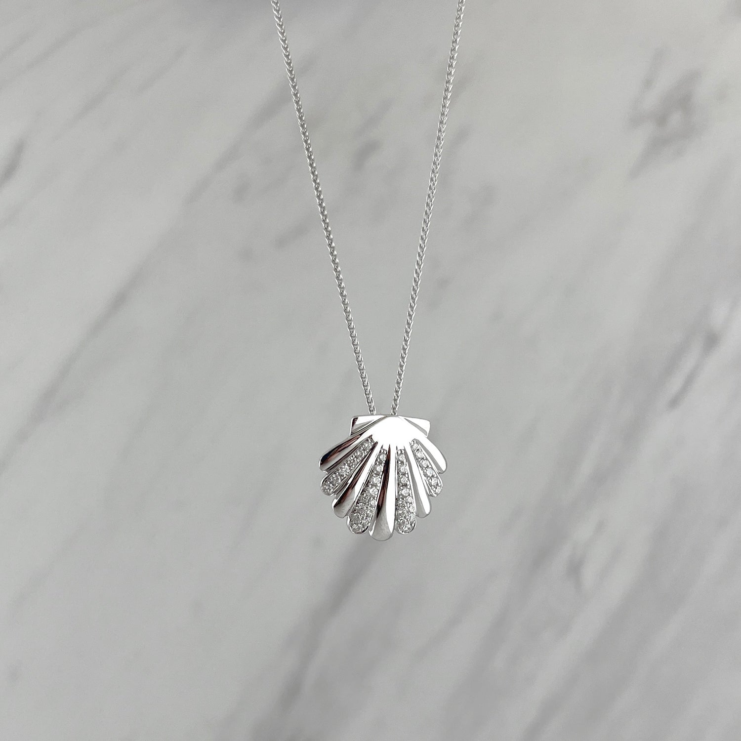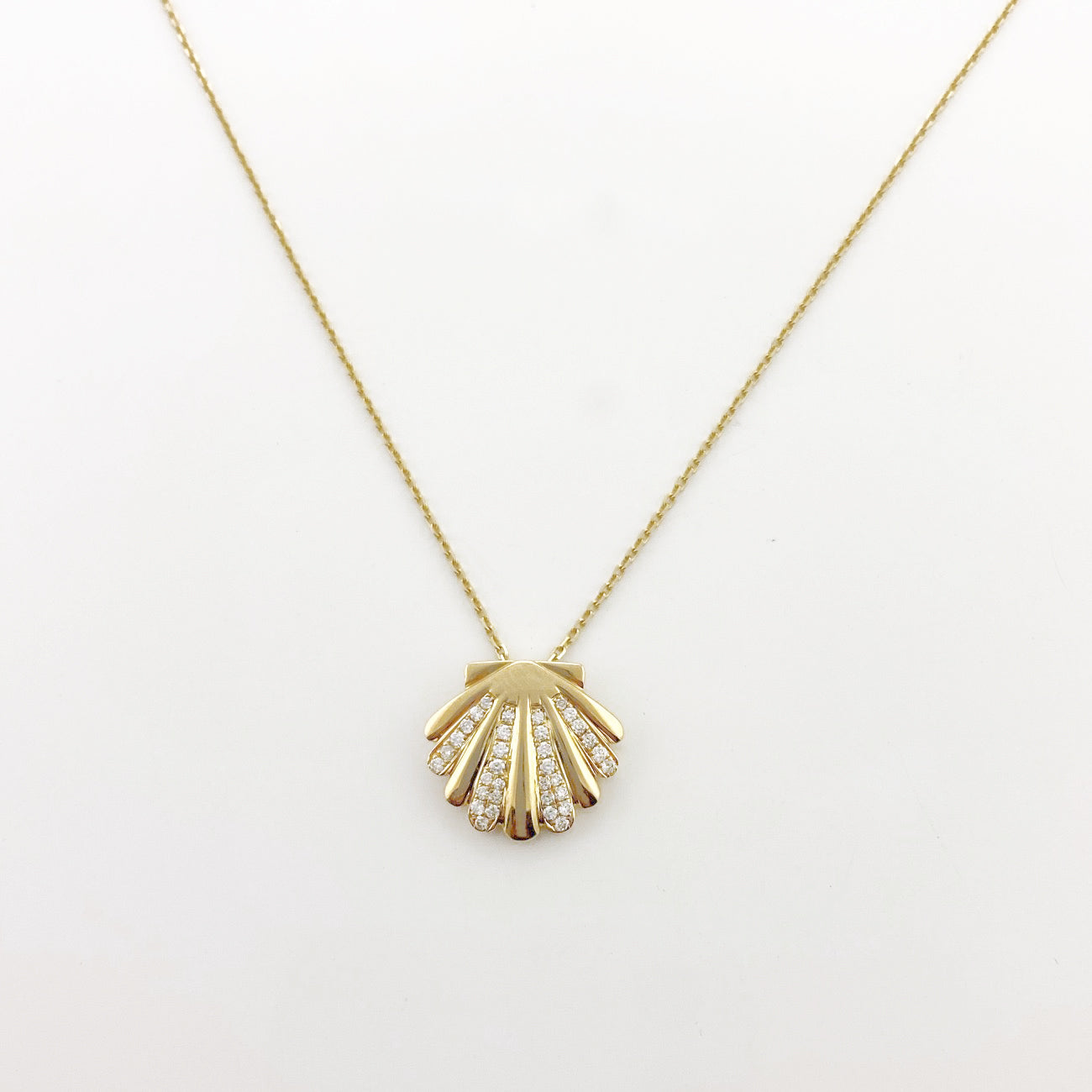 This gorgeous nautical necklace features a 14K gold scallop shell pendant with 35 sparkling round diamonds for a total carat weight of .20