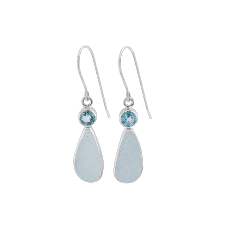 Designed by Misti Martin, these beautiful drop earrings feature a colored teardrop shaped natural sea glass along with a round blue topaz set in sterling silver with a wire post.