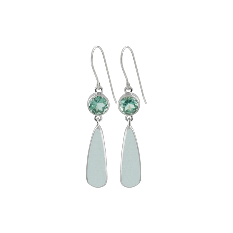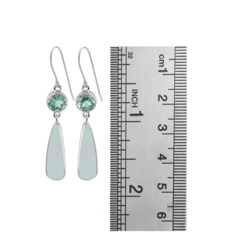 Designed by Misti Martin, these earrings feature green quartz and aqua sea glass set in sterling silver for a stunning combination of ocean colors. Earrings have a ear wire and measure just under 2" in length.