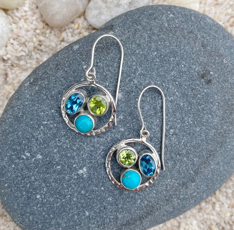 These beautiful drop earrings, designed by Misti Martin, are handcrafted from hammered sterling silver and feature a trio of vibrant gemstones including blue topaz, peridot and turquoise set in sterling silver.