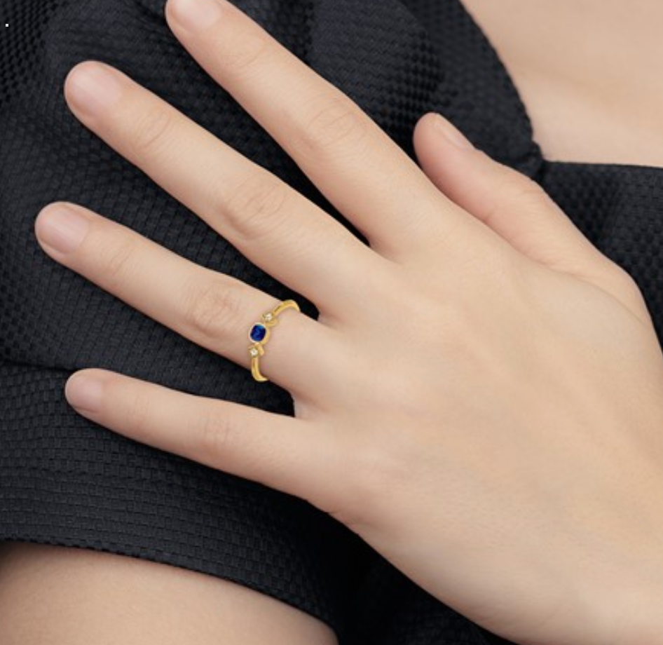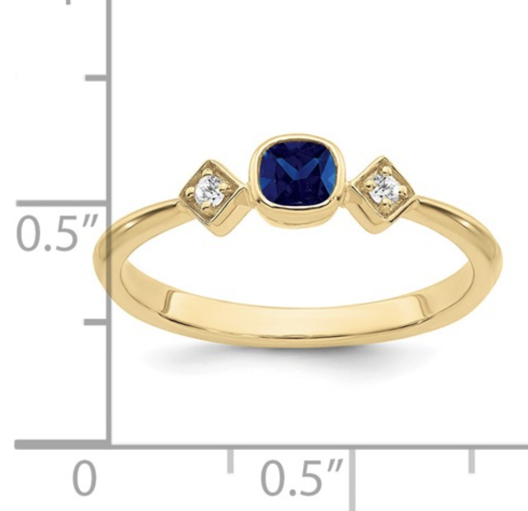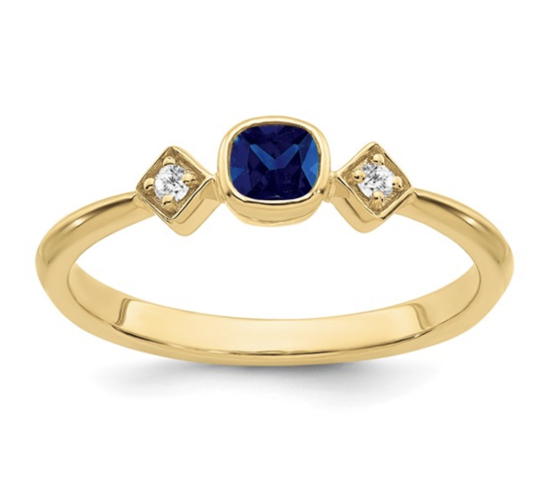 This dainty ring is crafted in 14k yellow gold and features two round diamonds prong set in a diamond shape and a square cut blue sapphire with a delicate bezel setting. Great for layering and wearing everyday!