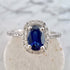 This dainty ring is perfect for every day wear. It is crafted in 14k white gold and features a .66 ct blue sapphire surrounded by a halo of petite diamonds. Diamonds line the top of the band for added sparkle!