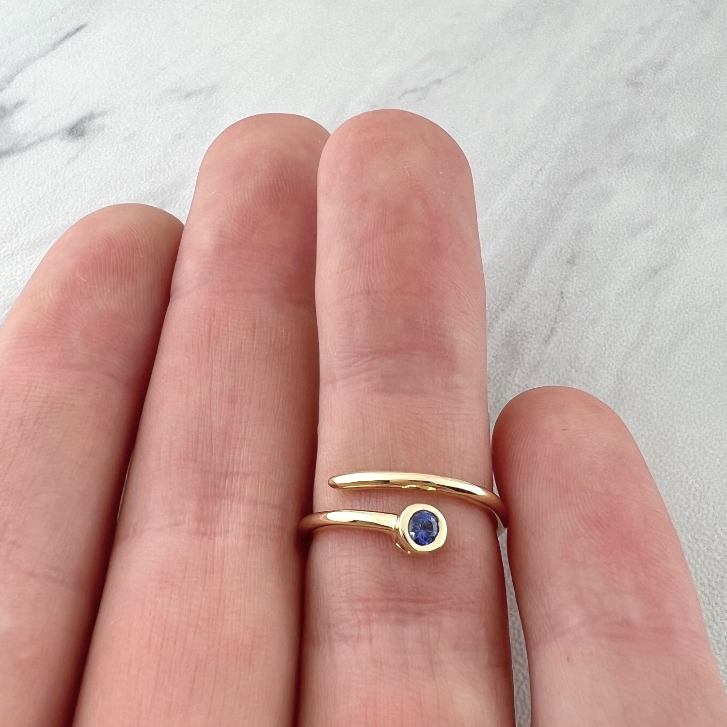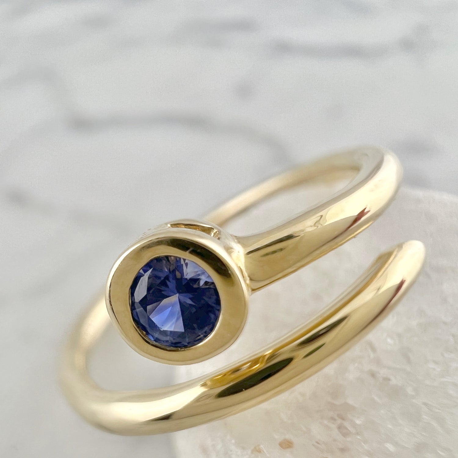This .11 ct blue sapphire is bezel set in a 14k yellow gold band that hugs your finger. The band wraps around your finger for an fun, unique look.