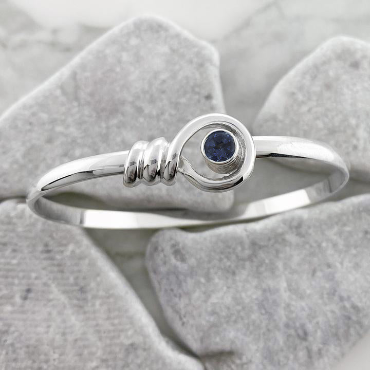 This Sterling Silver hook bracelet features a stunning semi rough cut Sapphire gemstone set in the classic Shepherd's Knot. Sapphire is the birthstone for the month of September.