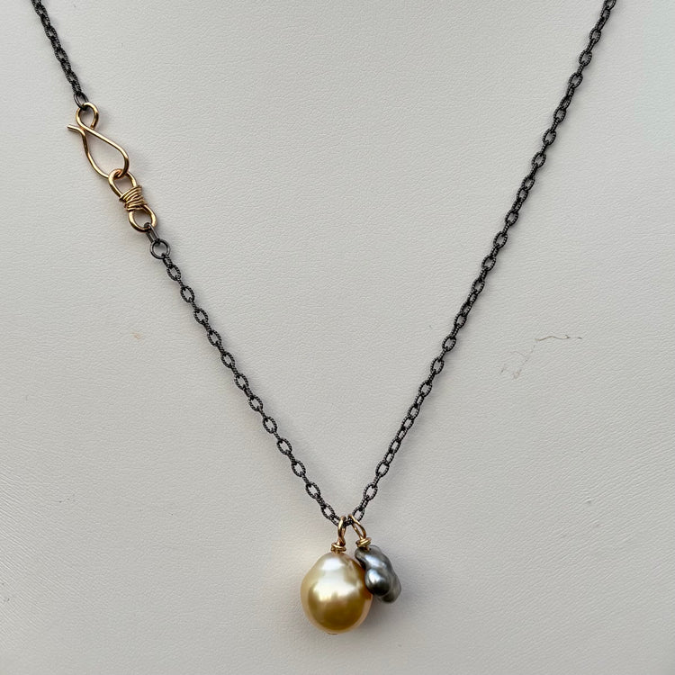 Sterling silver oxidized black chain with handmade gold-filled clasp and a stunning duo of Golden South Sea Pearl and Gray Tahitian Keshi pearl. 24 inches long. Golden South Sea Pearl measures approx 11mm.