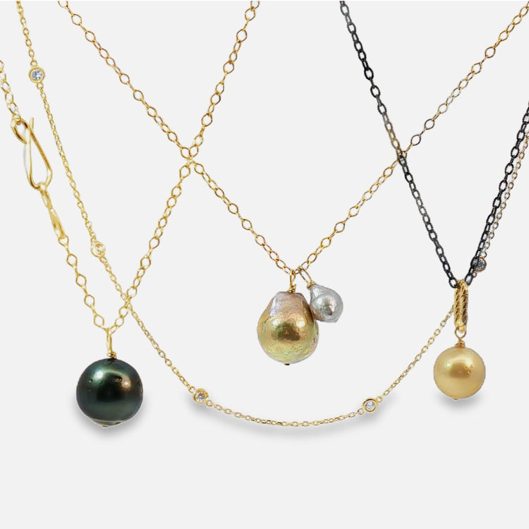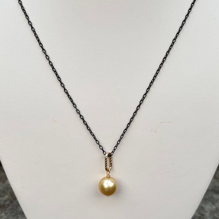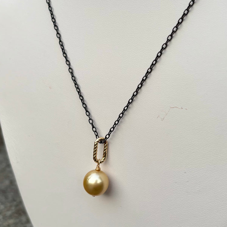 A stunning Golden South Sea pearl is the centerpiece of this necklace.  Features a darkened oxidized sterling silver chain paired with a 14K gold textured oval snap lock, which allows for other pendants and charms to be added, if desired.  Pearl measures approximately 11 mm and has beautiful color, luster and surface quality.  A wonderful and versatile piece, handmade on Cape Cod.