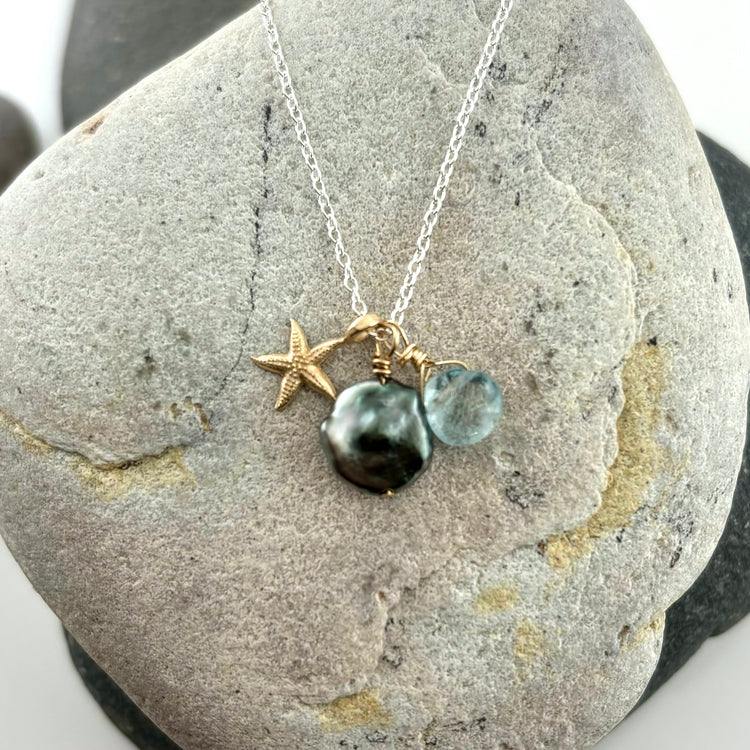 This petite charm necklace features a 14K yellow gold starfish, a Tahitian Keshi pearl, and a blue topaz briolette, clustered together on an adjustable sterling silver cable chain.  Necklace has a sliding adjustable bead at clasp, allowing it to be worn at any length up to 20". Handmade on Cape Cod.