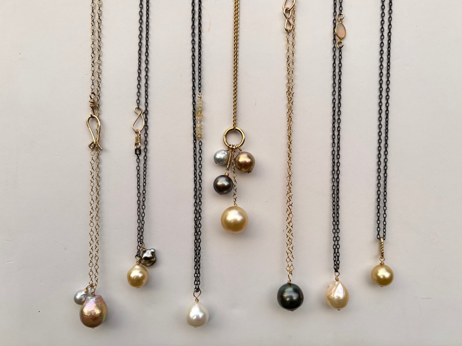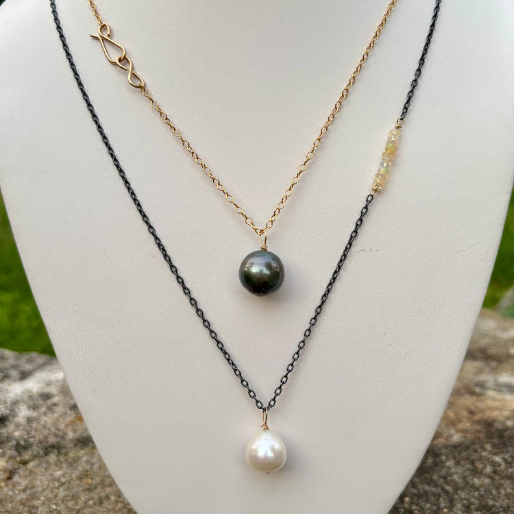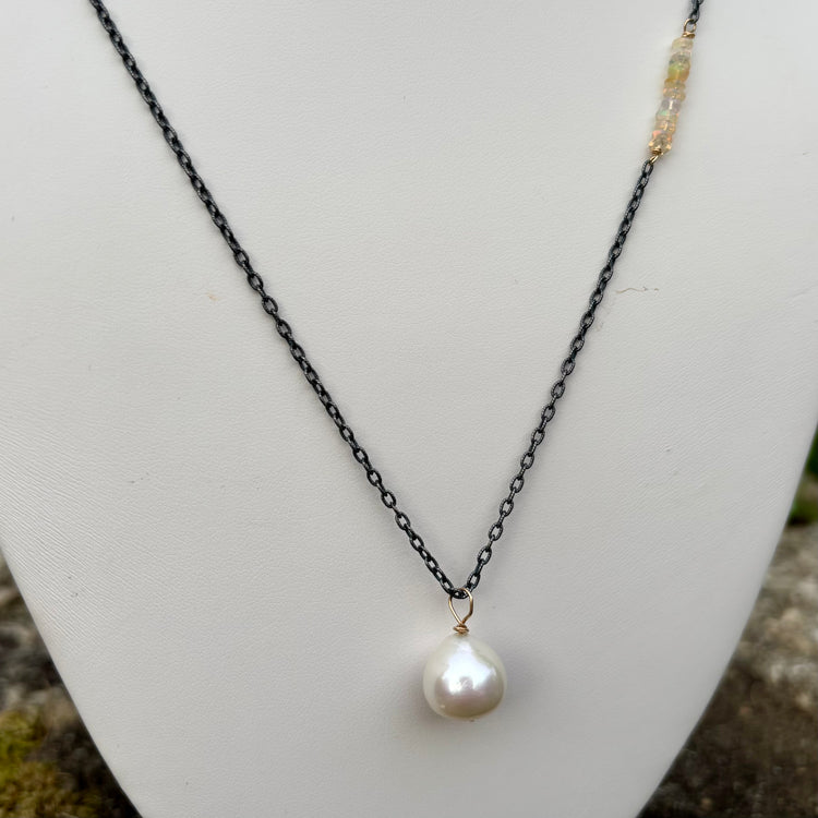 This necklace features blackened oxidized sterling silver chain, accented with natural opal beads and anchored by a large white freshwater baroque pearl. Pearl has gorgeous luster and shimmer, like moonlight against a misty evening sky. Necklace is handmade on Cape Cod and measures approximately 24" long.