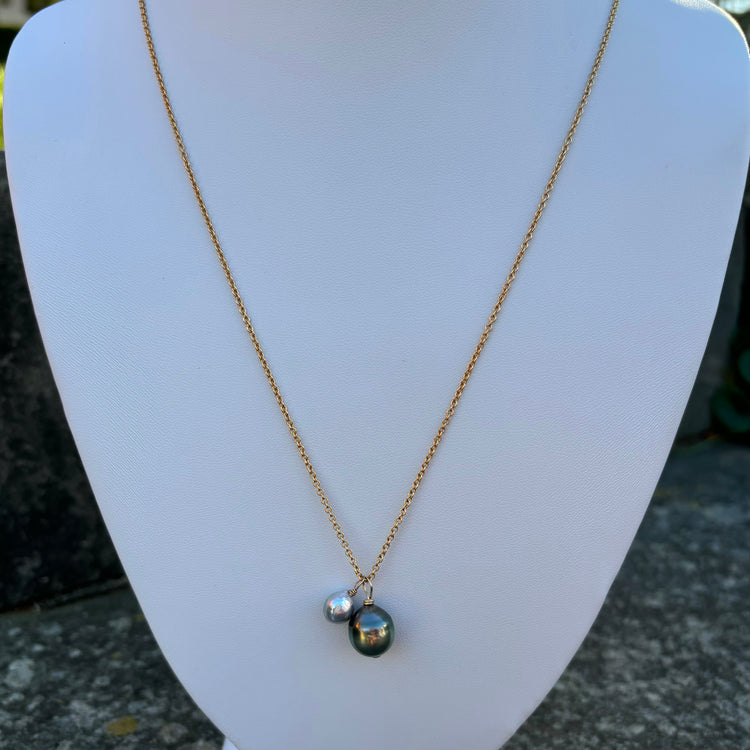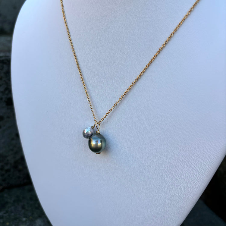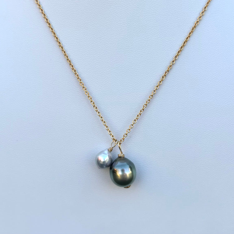 This handmade necklace pairs a deep gray Tahitian baroque shaped pearl with a light silvery gray Akoya baroque pearl.  The duo is a perfect match, in color and relative size. Pearls are high quality, with beautiful luster and natural colors.  They are suspended from a 14K gold filled cable chain, approximately 24" long.