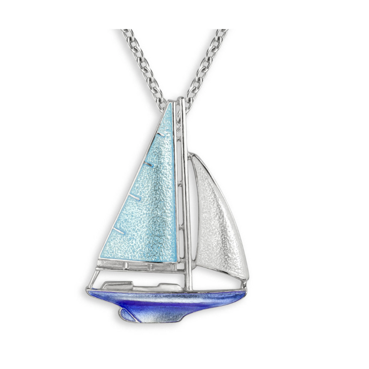 Blue Sailboat Necklace in Sterling Silver with Vitreous Enamel. Adjustable 18-inch chain included. Rhodium Plated for easy care.