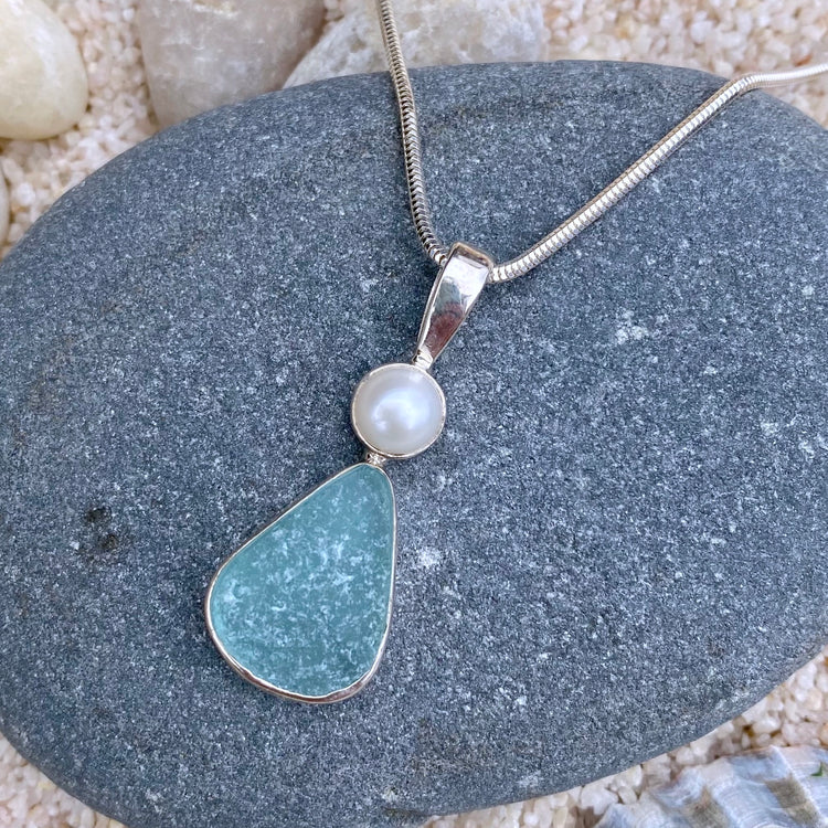 Designed by Misti Martin, this beautiful necklace features an aqua colored teardrop shaped natural sea glass piece with a freshwater pearl, set in sterling silver. It comes on a sterling silver 18" snake chain. (Please email us if you need another length!)