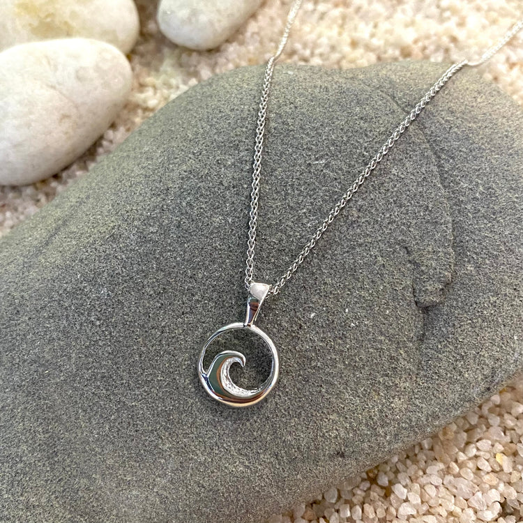Available in 14K Gold or Sterling Silver, this tiny necklace is perfect for ocean lovers! The pendant features a circular design with a polished wave in the center and a slight texture on one side of the wave for a 3-dimensional look!