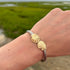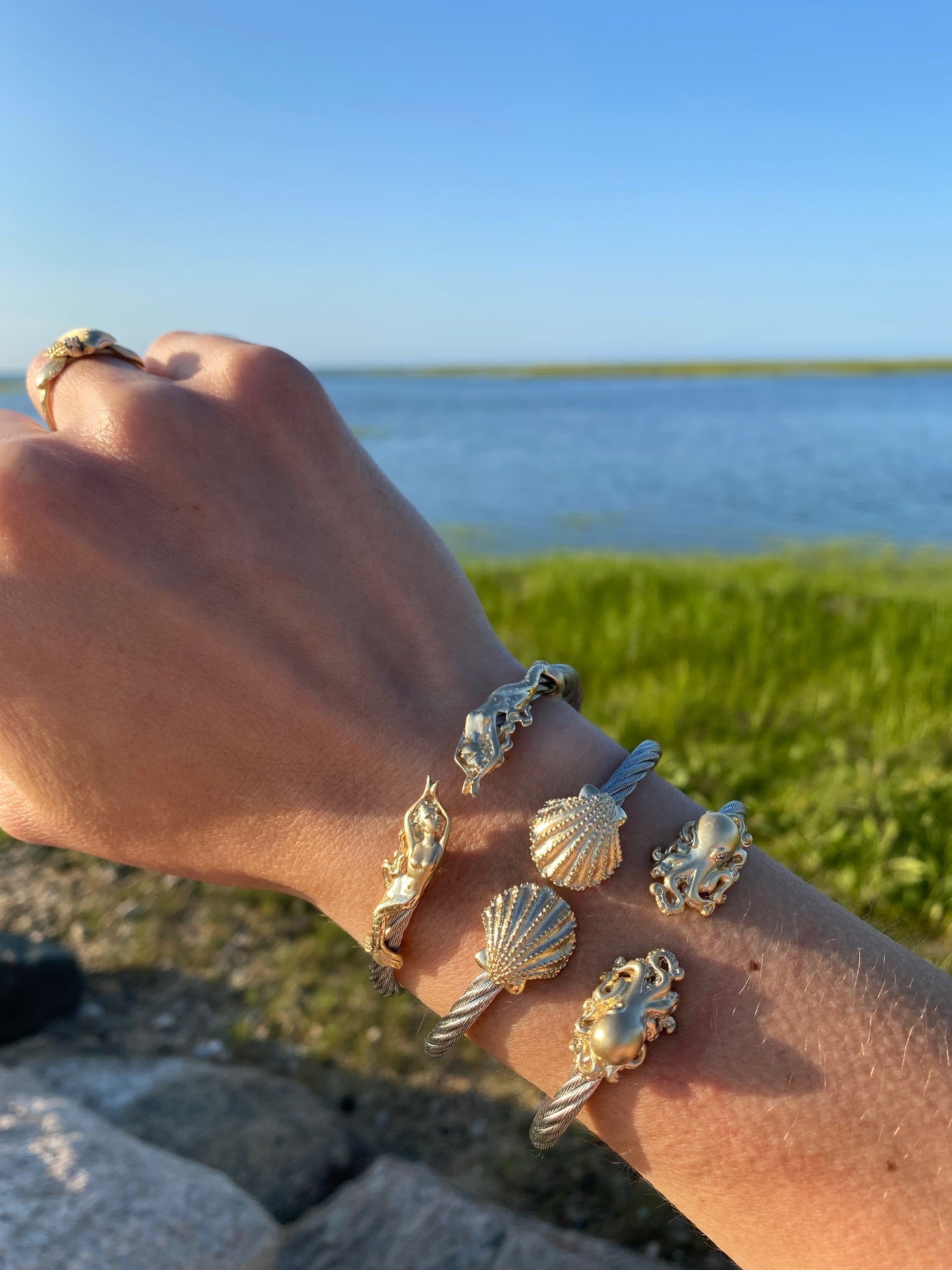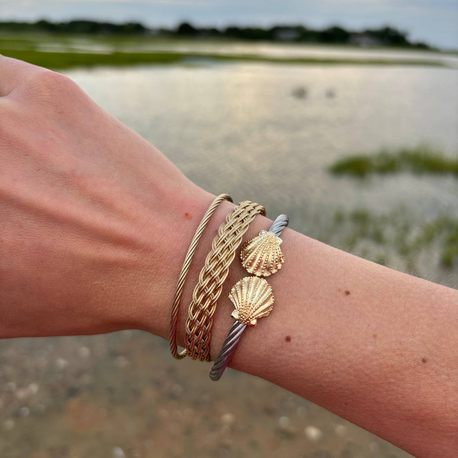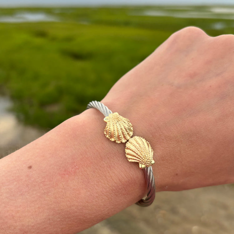 14k gold scallop shells are mixed with marine grade stainless steel cable for a timeless two-tone look. Beautiful details and finishing make all Steven Douglas pieces extra special. This bracelet is suitable for wrist sizes 7-7.5 inches.