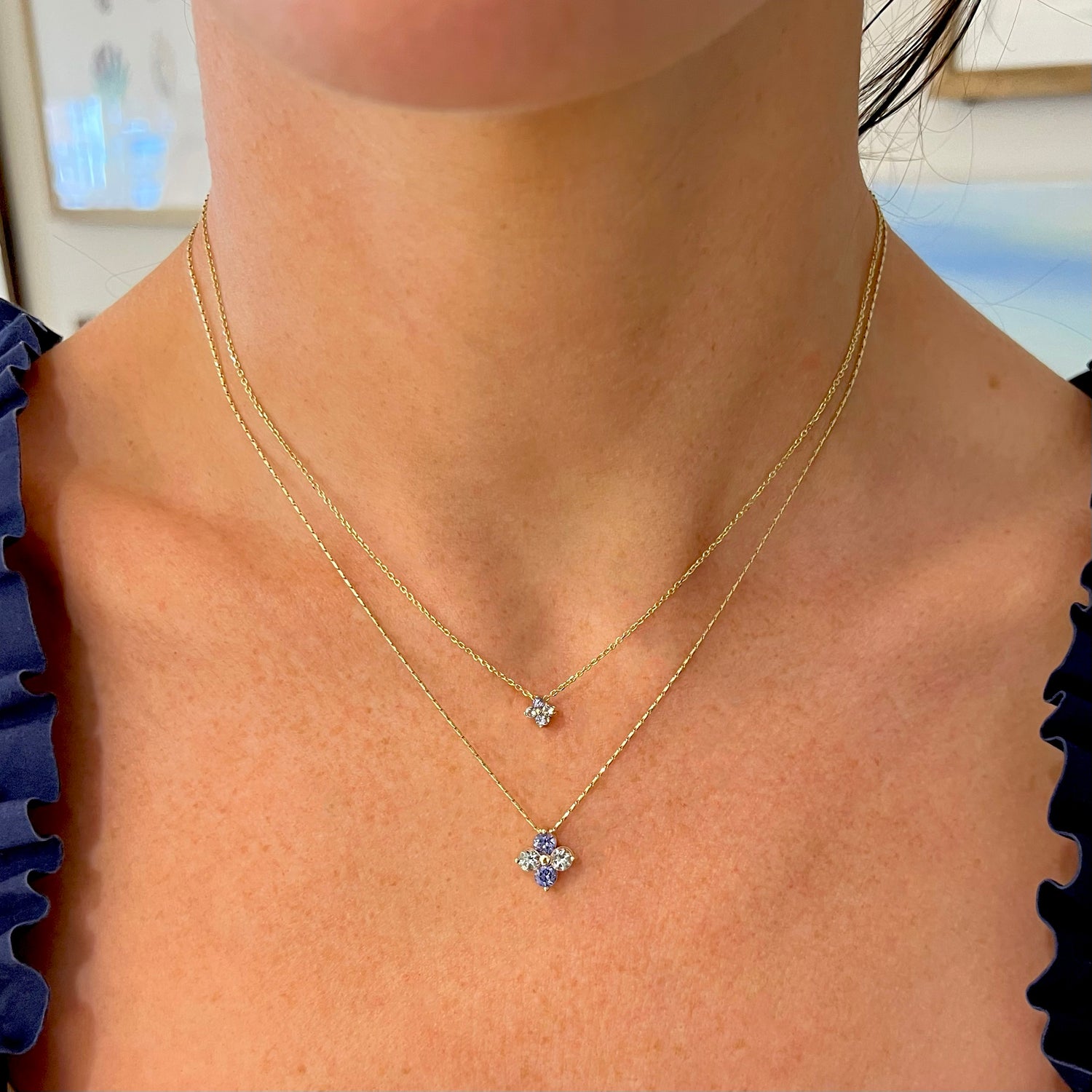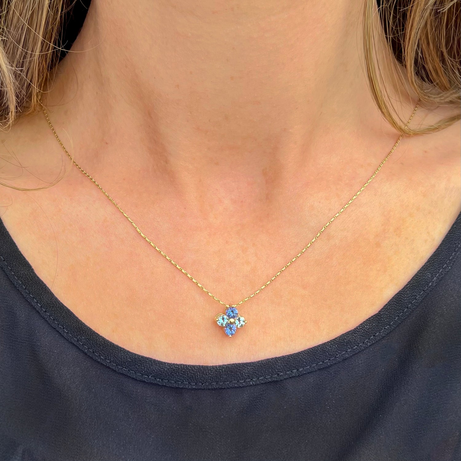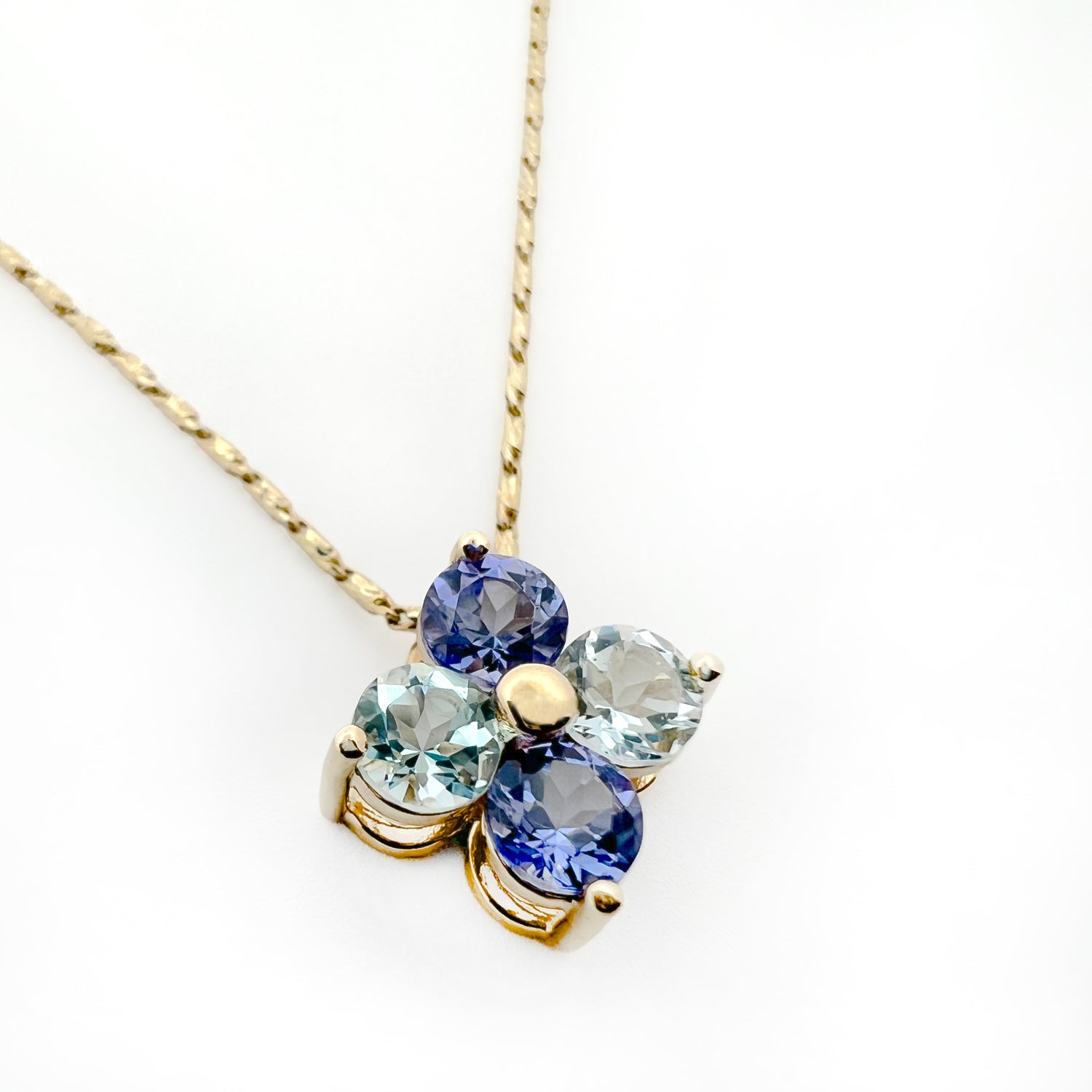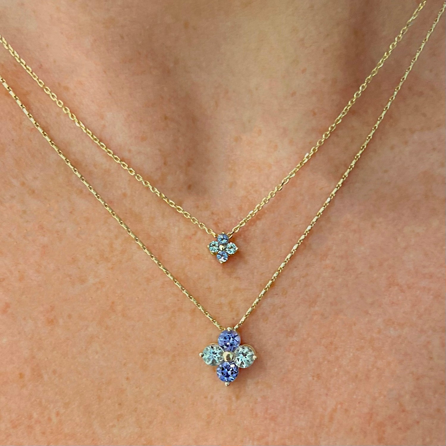 Introducing a new Cape Cod Jewelers exclusive piece - the Cape Cod Hydrangea Necklace. Crafted from recycled solid 14k gold and set with natural, high quality tanzanite and blue topaz. This is a special necklace with gemstones that glow. The length of the chain is 18".