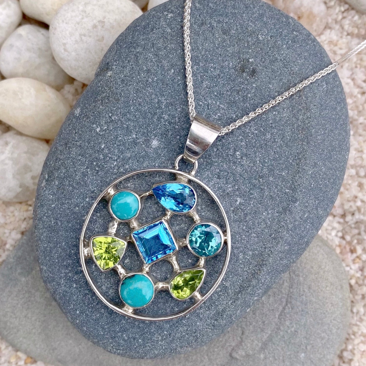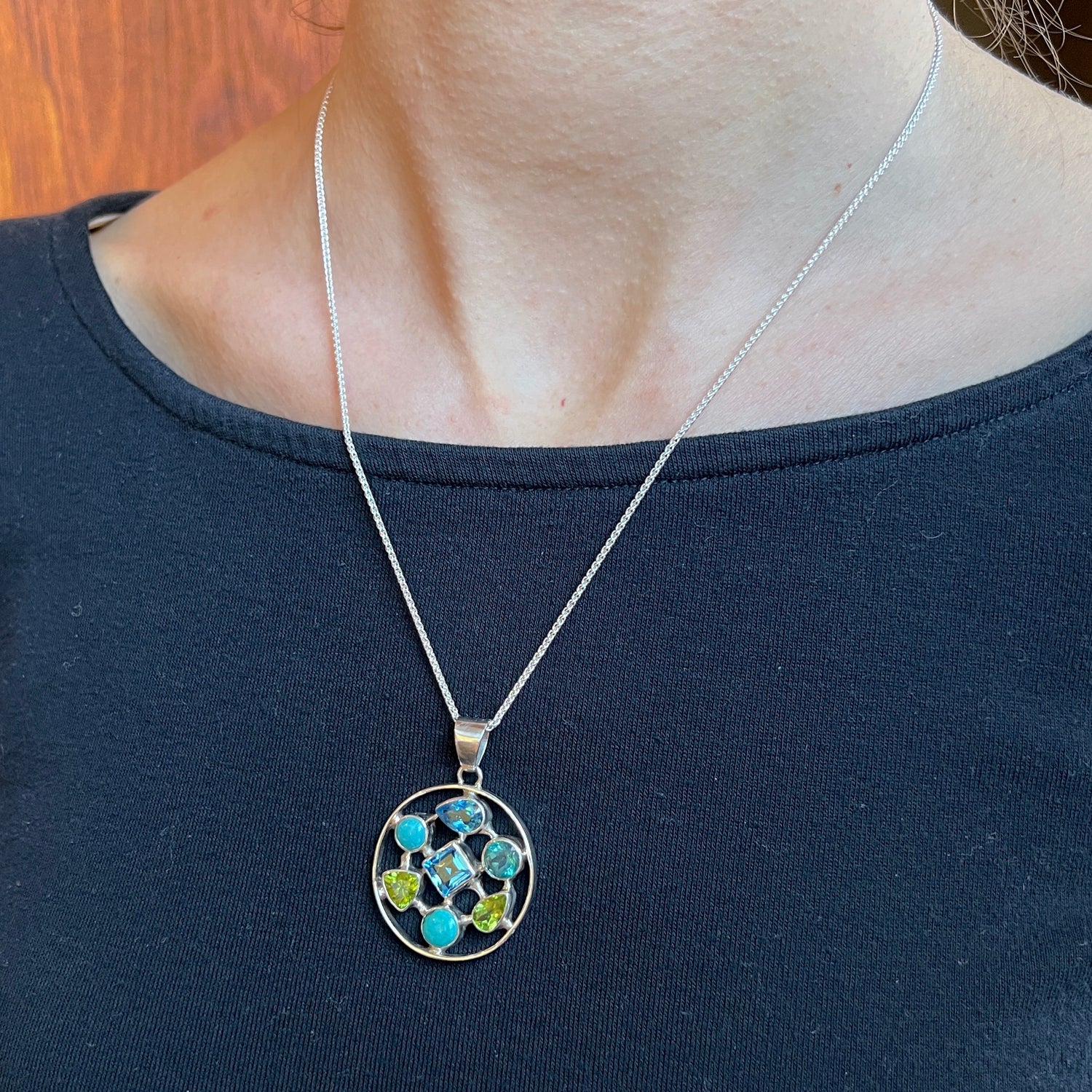 Designed by Misti Martin, this beautiful statement necklace is handcrafted in sterling silver and features gemstones of varying shapes, including blue topaz, peridot, turquoise and apatite. The pendant is substantial in size and measures approximately 1.5 inches across.