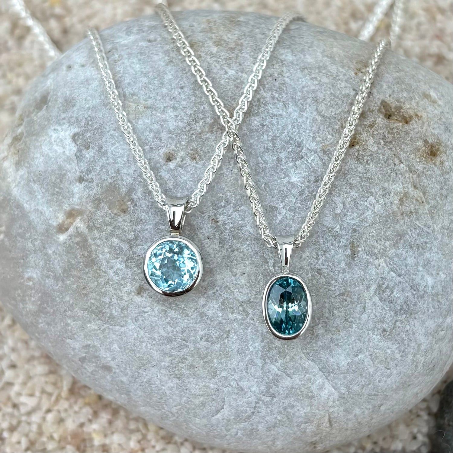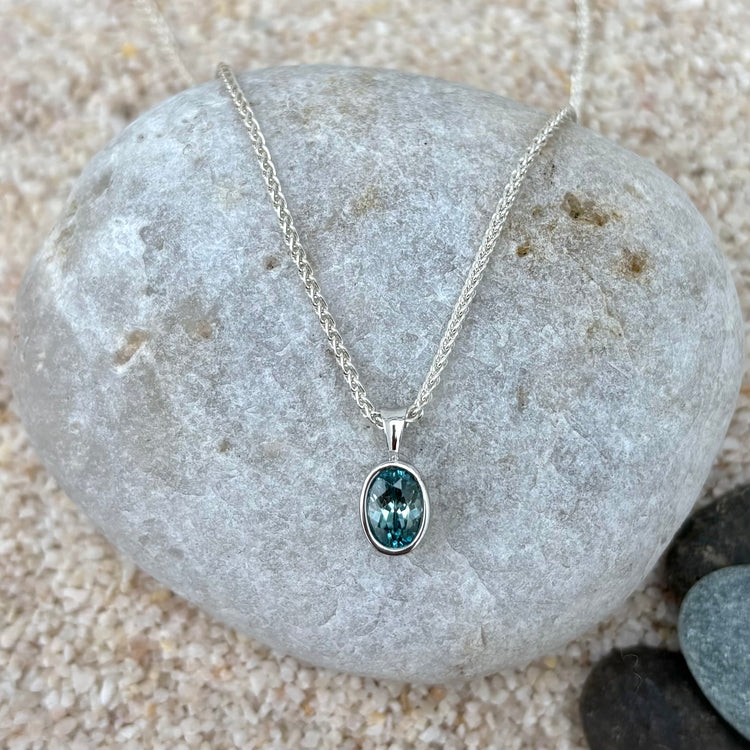This vibrant 1.27 ct oval Blue Zircon is bezel set in sterling silver. The pendant comes on an adjustable 16-20" sterling silver wheat chain.