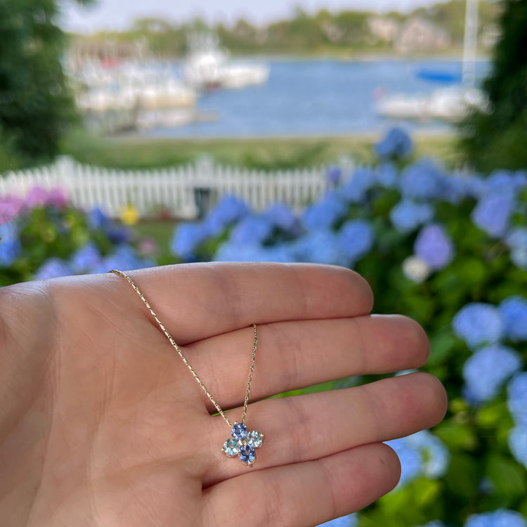 Introducing a new Cape Cod Jewelers exclusive piece - the Cape Cod Hydrangea Necklace. Crafted from Sterling Silver and set with natural tanzanite and blue topaz. This is a special necklace with gemstones that glow. The length of the chain is 18".
