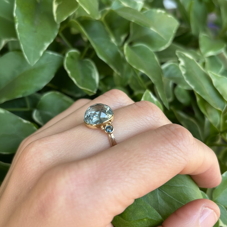 Handmade by Emily Amey in Hudson Valley, NY. This ring is crafted from 14K Gold and Sterling Silver and features a gorgeous large, aqua blue topaz that is rose cut. Blue sapphires accent each side. The sterling silver band beautifully features natural curves and contrasts with the 14K gold bezel and bead details.