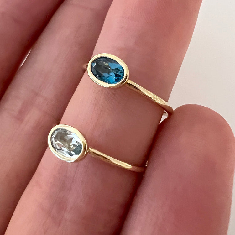 This ring features an oval cut London Blue Topaz bezel set in 14k gold. This ring looks great alone or stacked with your favorite rings for a fun layered look
