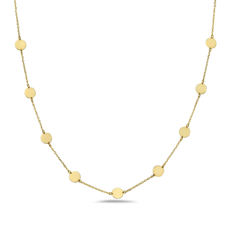This station necklace is perfect to wear alone or add to create your own unique layered look! This beautiful 14k necklace features nine 5mm discs spaced out on the adjustable 16-18" chain. This necklace also features a lobster clasp.