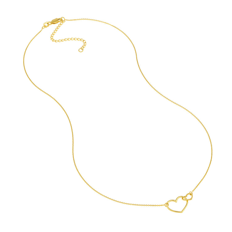 This 14k yellow gold necklace features a large and small heart linked together on an adjustable 16-18" chain.